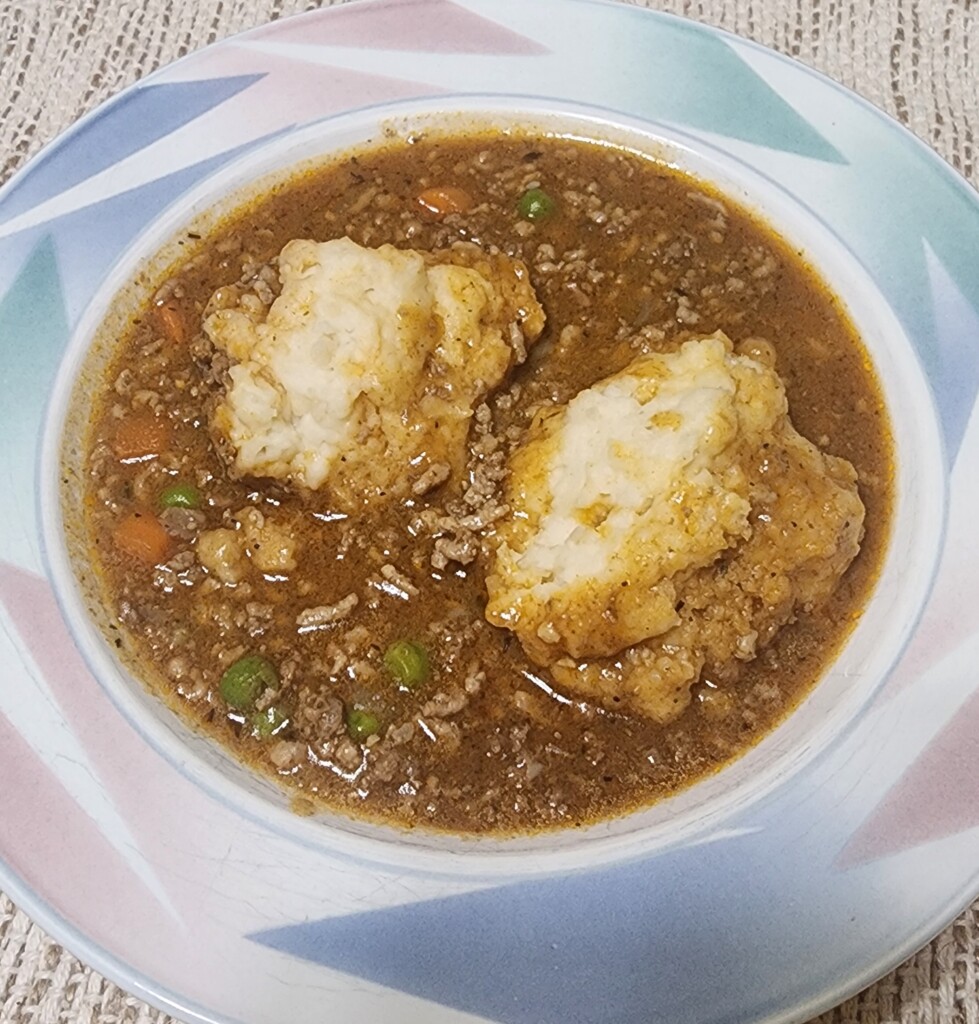 Keywords: ground beef, ground pork, dumplings, comfort food, beef broth, dinner