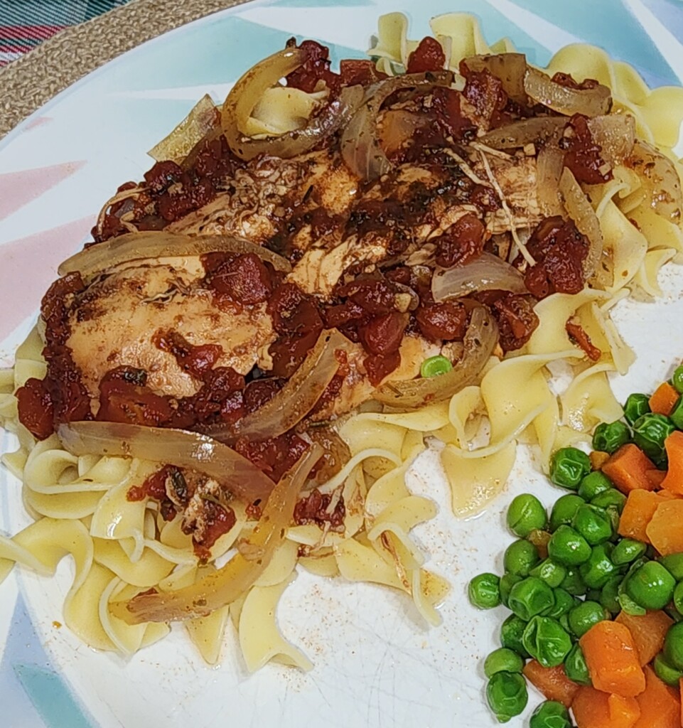 This dish is pretty simple – throw everything in the slow cooker and let it do the work. The balsamic vinegar plus the slow cooking results in a tangy chicken that’s falling apart when you try to pick it up; in fact, the original posting suggested shredding it before serving. I’ll add that in to the instructions. And the best part is you only need one pot to cook it (okay, there’s a second one for the egg noodles or rice or whatever sides you want… but the main dish is only one).